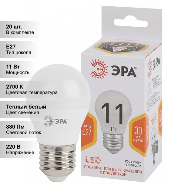Лампа светодиодная ЭРА Б0032987, E27, P45, 11 Вт, 2700 К