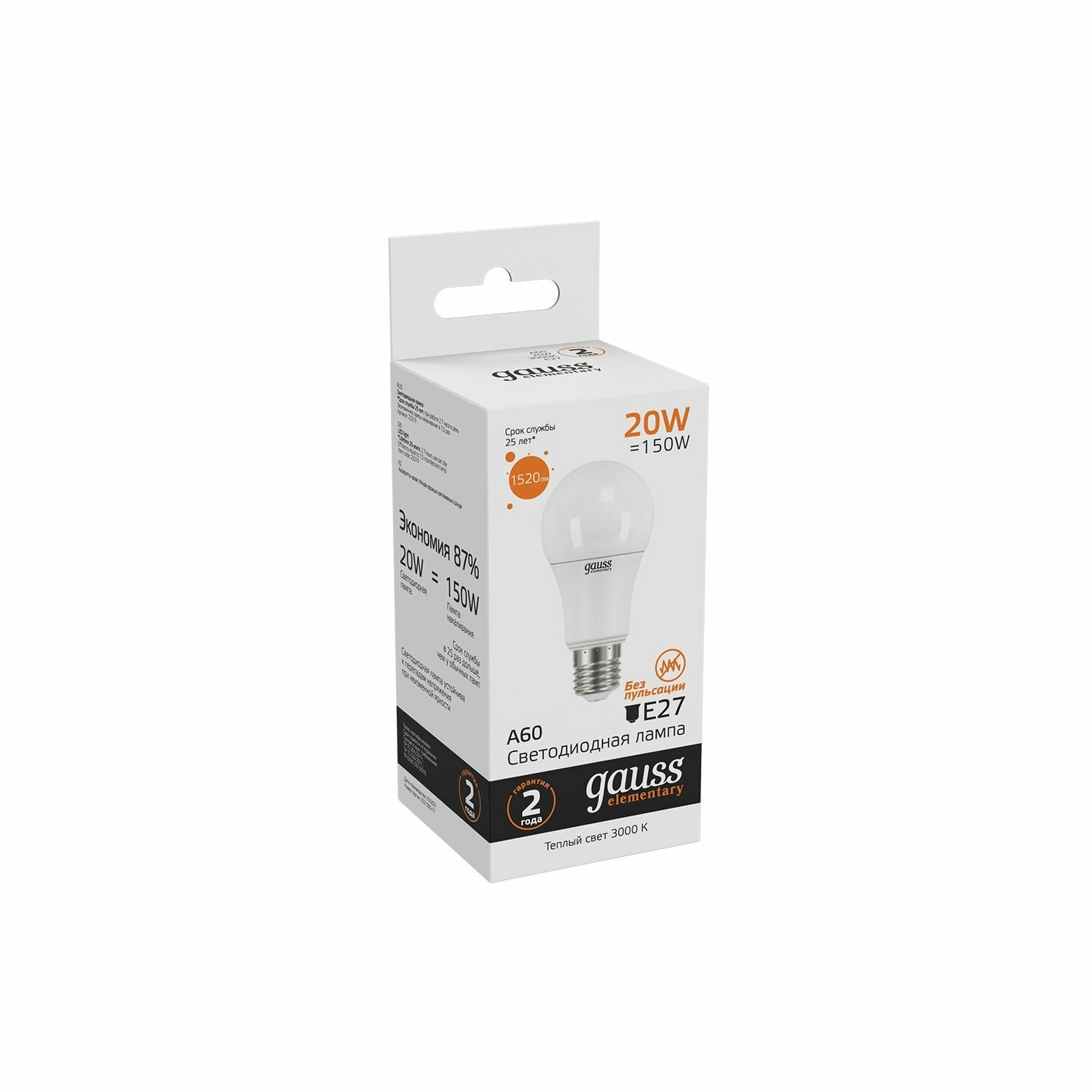 (5 шт)Лампа Gauss Elementary A60 20W 1520lm 3000K E27 LED 1/10/40