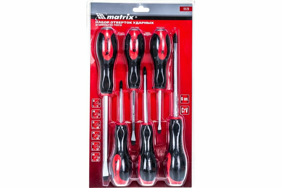 MATRIX 19120 Набор ударных отверток 6 шт, PH1x75, PH2x100, PH3x150, SL5x75, SL6x100, SL8x150, CrV Mat MATRIX 19120