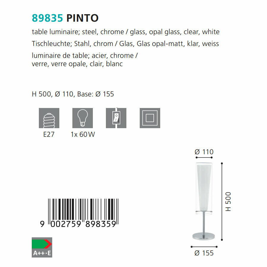 Ниже Вы можете прочитать отзывы на 89835 Настольная лампа EGLO Pinto, ознакомится с подробными характеристиками, посмотреть интересные обзоры и фотографии на 89835 Настольная лампа EGLO Pinto.