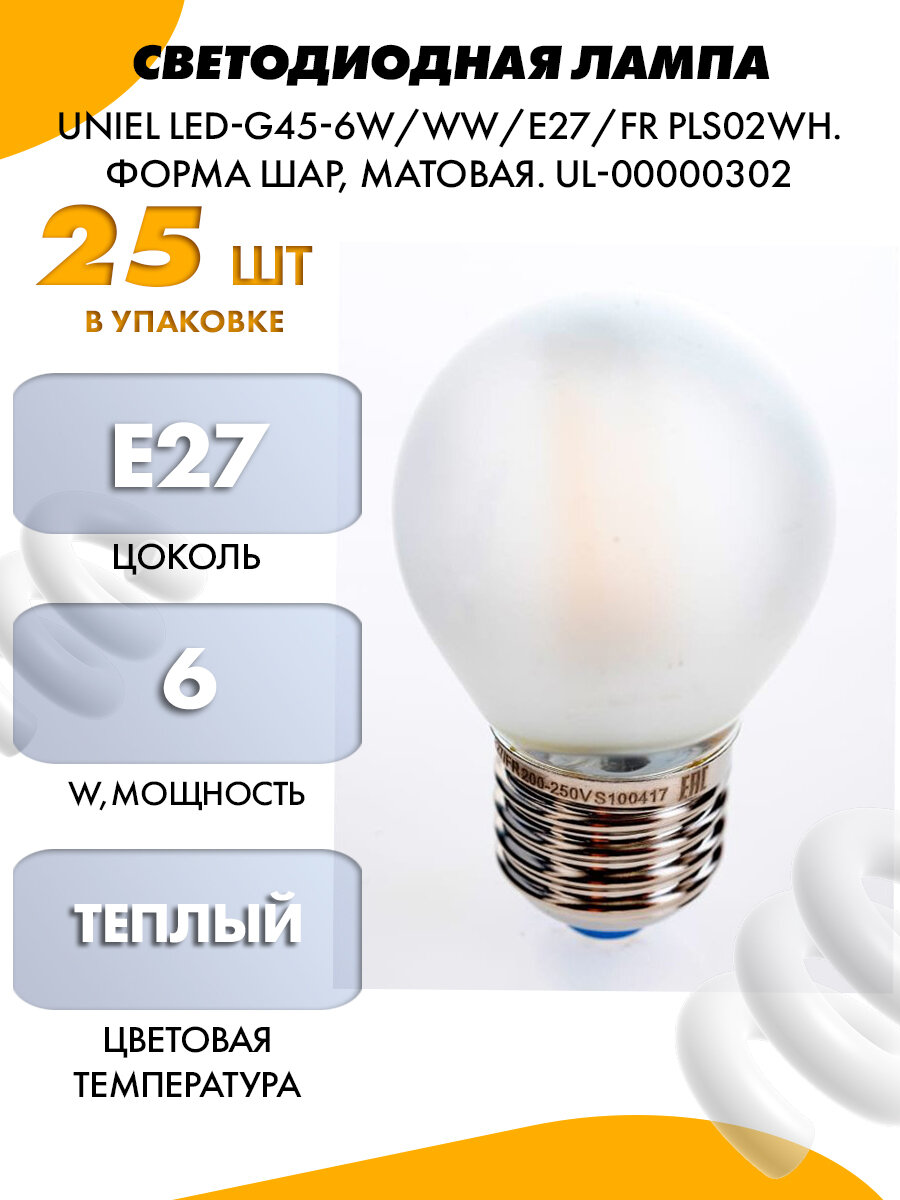 СохранитьUniel LED-G45-6W/WW/E27/FR PLS02WH Лампа светодиодная. Форма шар, матовая. UL-00000302 интересное: