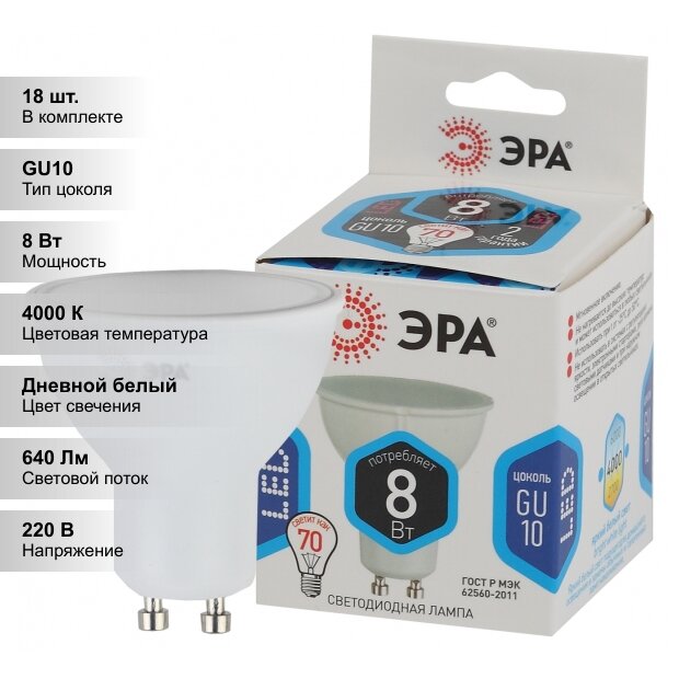 Купить (18 шт.) Светодиодная лампочка ЭРА MR16 8Вт 170-265В 4000К GU10