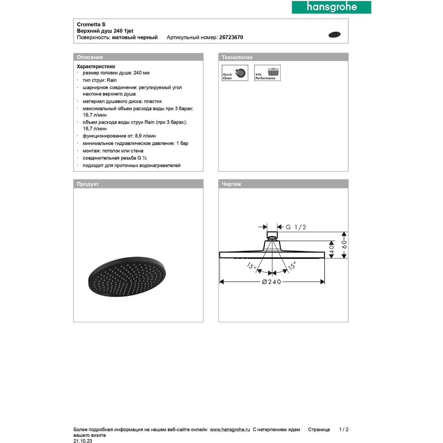 Ниже Вы можете прочитать отзывы на Верхний душ hansgrohe Crometta S 240 1jet 26723670, матовый черный, ознакомится с подробными характеристиками, посмотреть интересные обзоры и фотографии на Верхний душ hansgrohe Crometta S 240 1jet 26723670, матовый черный.