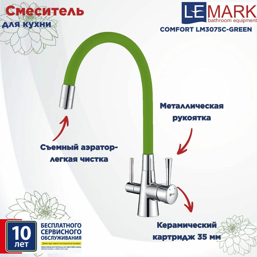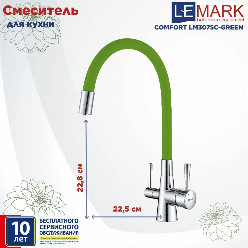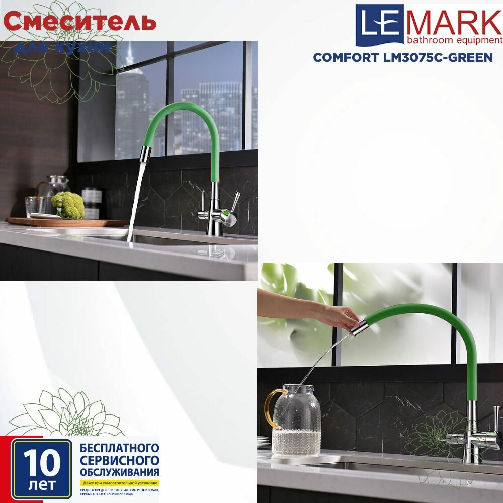 Смеситель для кухни, с гибким изливом, с подключением к фильтру питьевой воды, хром/зеленый LEMARK LM3075C-Green Comfort