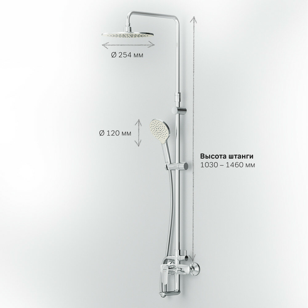 | Дополнительная информация | 3 режима ручного душа: Spray, EnerJet, Spray+Massage; регулируемая высота стойки для душа 1030-1460 мм; диаметр душевой лейки: 120 мм; диаметр верхнего душа: 254 мм |
