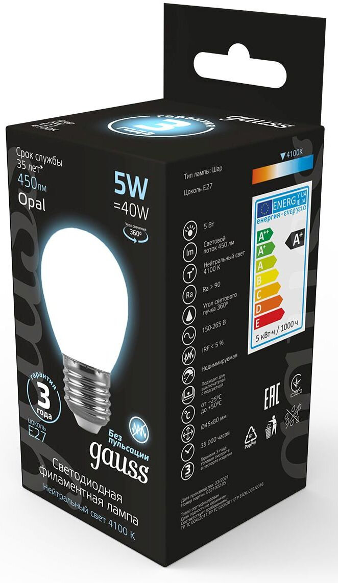 Лампа Gauss LED Filament Шар OPAL E27 5W 450lm 4100K 105202205