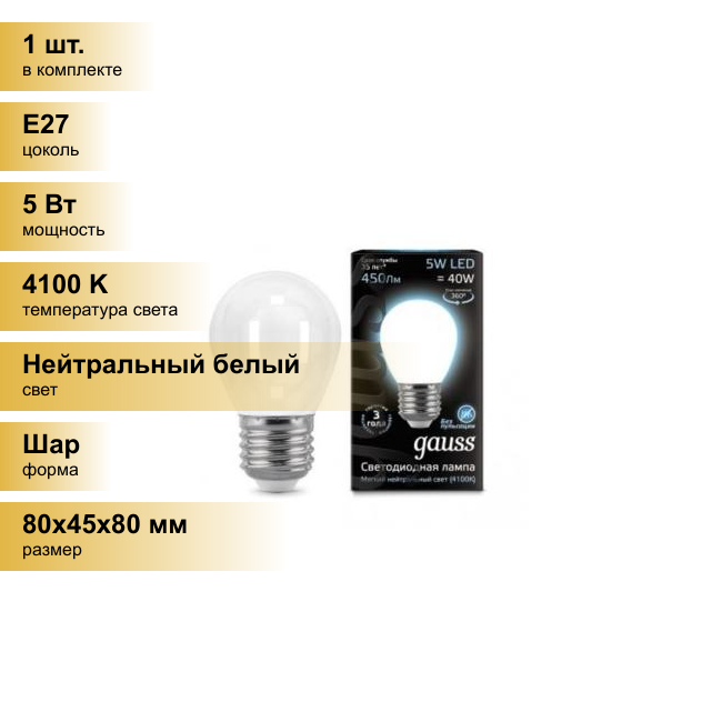 Светодиодная лампа Gauss "Шар" 5Вт 450Лм Е27 4100К