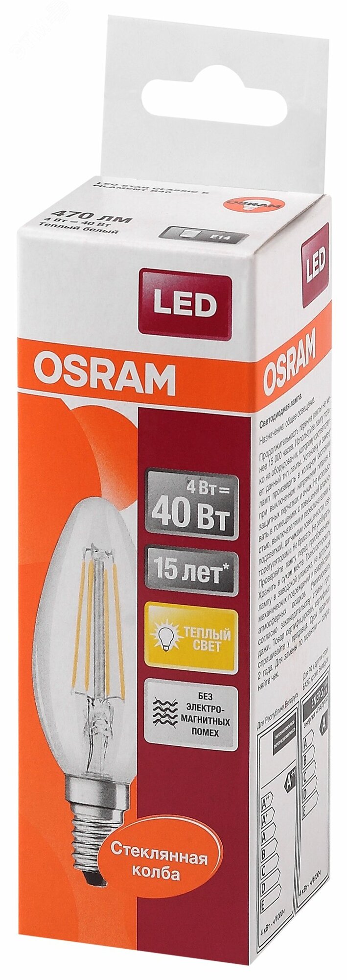 Лампа светодиодная 4 Вт филаментная E14 CLB40 700K 470Лм прозрачная 220 В свеча LS 4058075068353 OSRAM интересное: