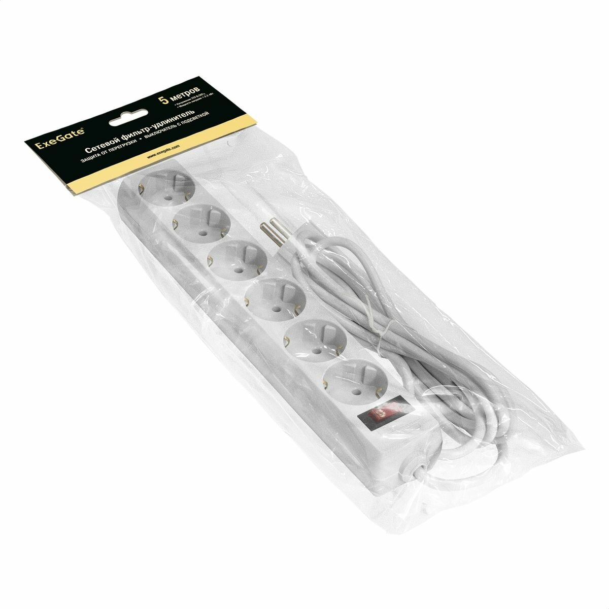 Сетевой фильтр ExeGate SP-6-5W (6 евророзетки с заземлением, 5м, защита от перегрузки, выключатель с подсветкой, белый) EX221229RUS