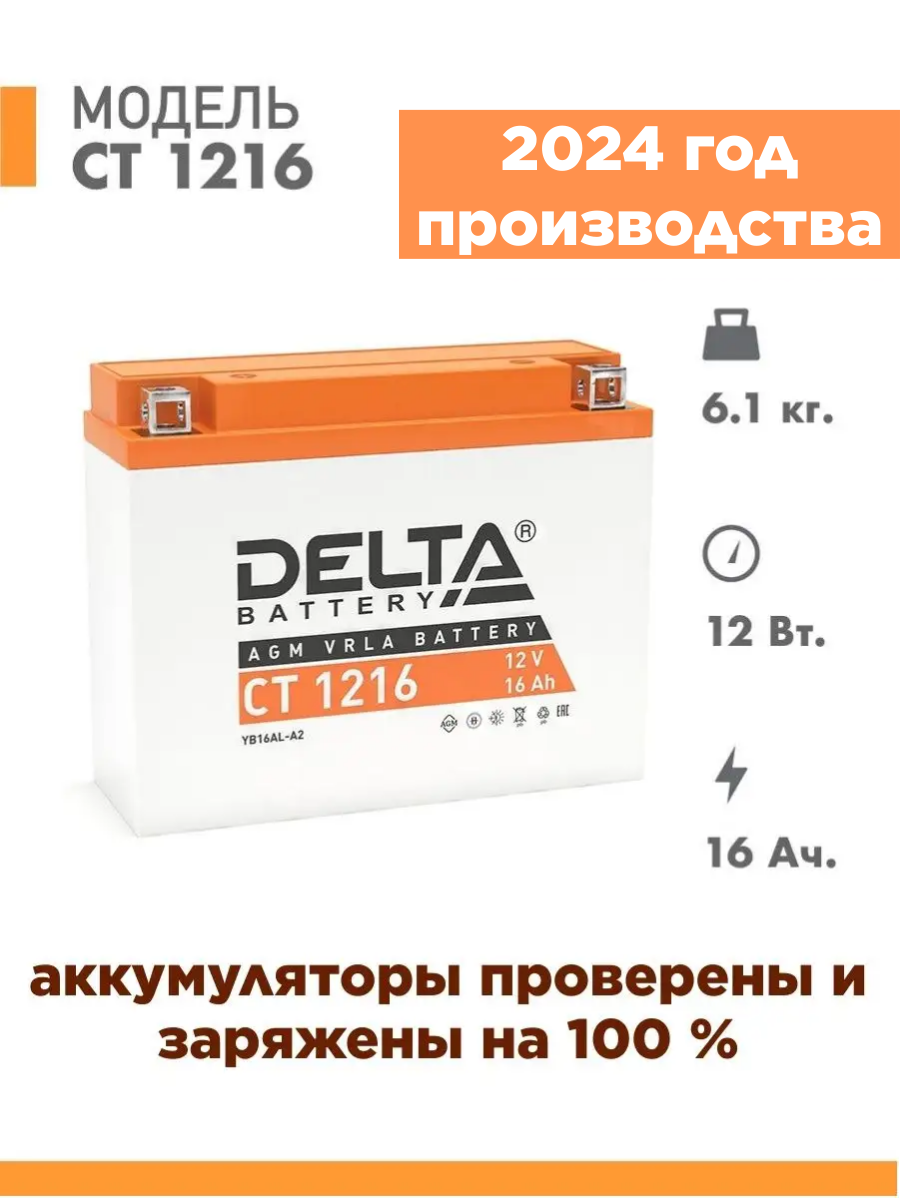 Ниже Вы можете прочитать отзывы на Мото аккумулятор стартерный Delta CT 1216 12 В 16 Ач обратная полярность 200А (12V 16Ah) (YB16AL-A2) AGM, для мотоцикла, мопеда, скутера, квадроцикла, снегохода, дизельных генераторов, ознакомится с подробными характеристиками, посмотреть интересные обзоры и фотографии на Мото аккумулятор стартерный Delta CT 1216 12 В 16 Ач обратная полярность 200А (12V 16Ah) (YB16AL-A2) AGM, для мотоцикла, мопеда, скутера, квадроцикла, снегохода, дизельных генераторов.