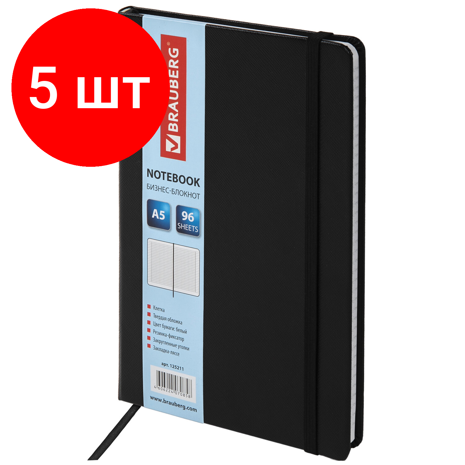 Купить Комплект 5 шт, Блокнот А5 (148х218 мм), BRAUBERG "Select", 96 л., балакрон, резинка, клетка, черный, 125211