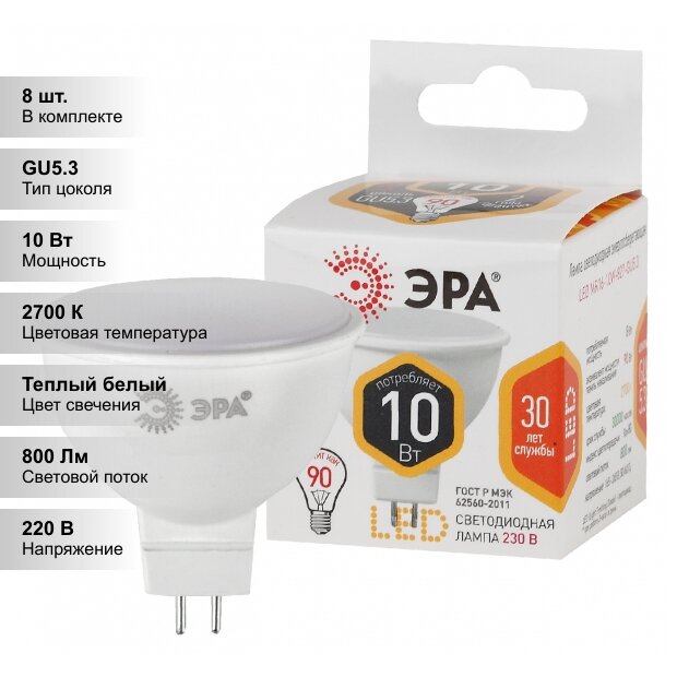 (16 шт.) Светодиодная лампочка ЭРА MR16 10Вт 170-265В 2700К GU5.3