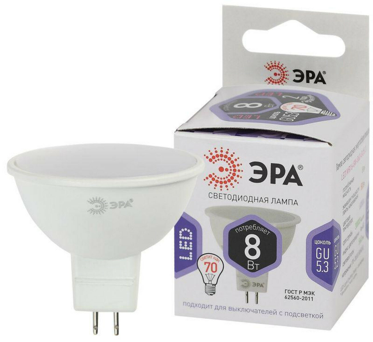 Лампа LED MR16-8W-860-GU5.3 ЭРА (диод, софит, 8Вт, холод, GU5.3), 1шт