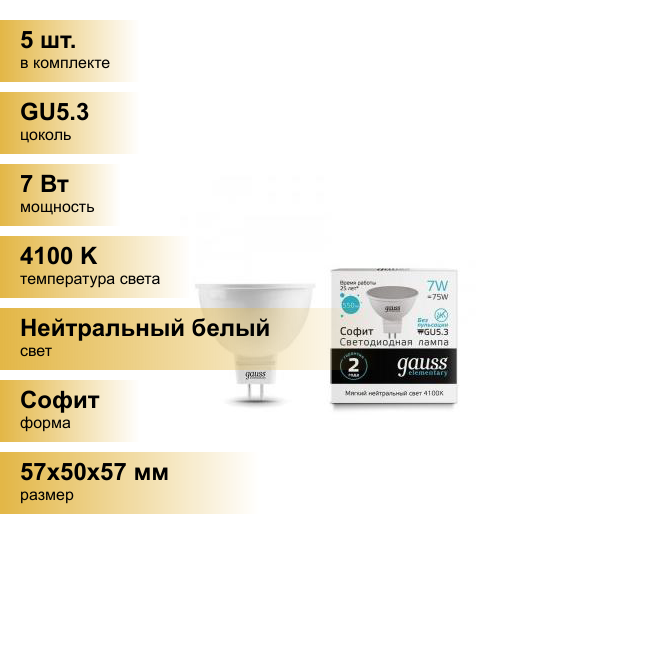 Сохранить(5 шт.) Светодиодная лампочка Gauss Elementary MR16 GU5.3 220V 7W(550lm) 4100K 4K 57x50 пластик/алюм. 13527 Нейтральный белый. Цоколь GU5.3 интересное: