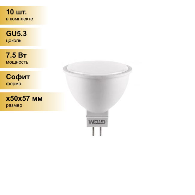 Купить (10 шт.) Светодиодная лампочка Wolta лампа св/д MR16 GU5.3 220V 7,5W(625lm) 6500K 6K матов 52X50 25WMR16-220-7.5GU5.3 . Цоколь GU5.3