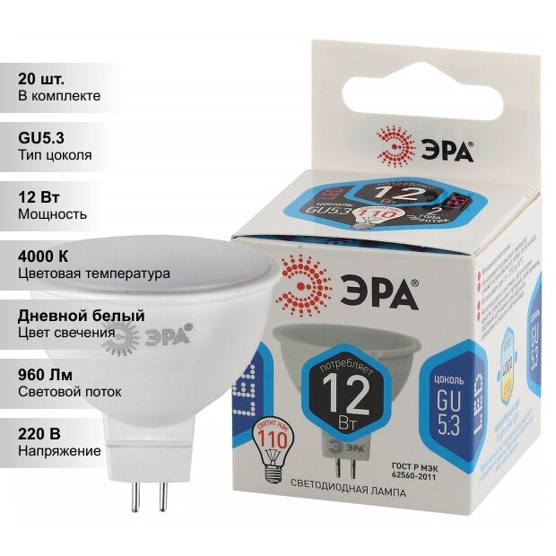 Лампочка светодиодная ЭРА LED MR16-12W-840-GU5.3 4000K софит 12 Вт