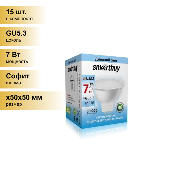 Купить (15 шт.) Светодиодная лампочка Smartbuy MR16 GU5.3 220V 7W(600lm) 4000K 4K 50x45 пластик SBL-GU5_3-07-40K-N . Цоколь GU5.3