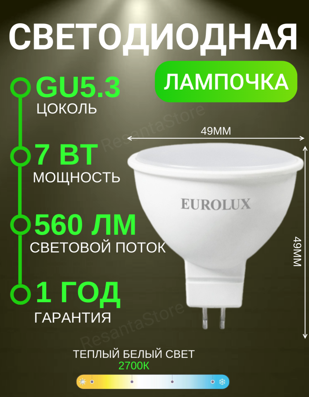 Светодиодная лампа Eurolux LL-E-MR16-7W-230-2,7K-GU5.3