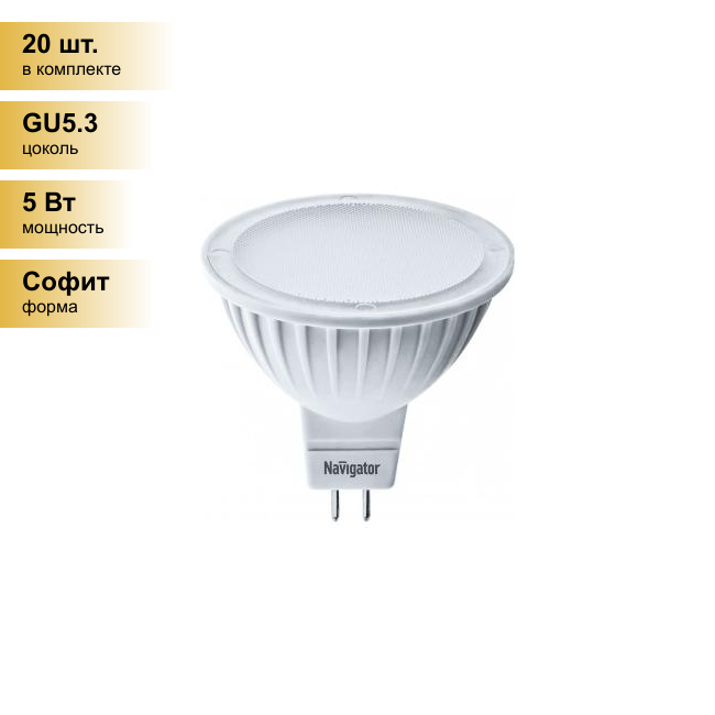 (20 шт.) Светодиодная лампочка Navigator MR16, мощность 7 Вт, напряжение питания 220 В, цветовая температура 3000 K, теплый белый свет, цоколь GU5.3, размер Ø50х52 мм