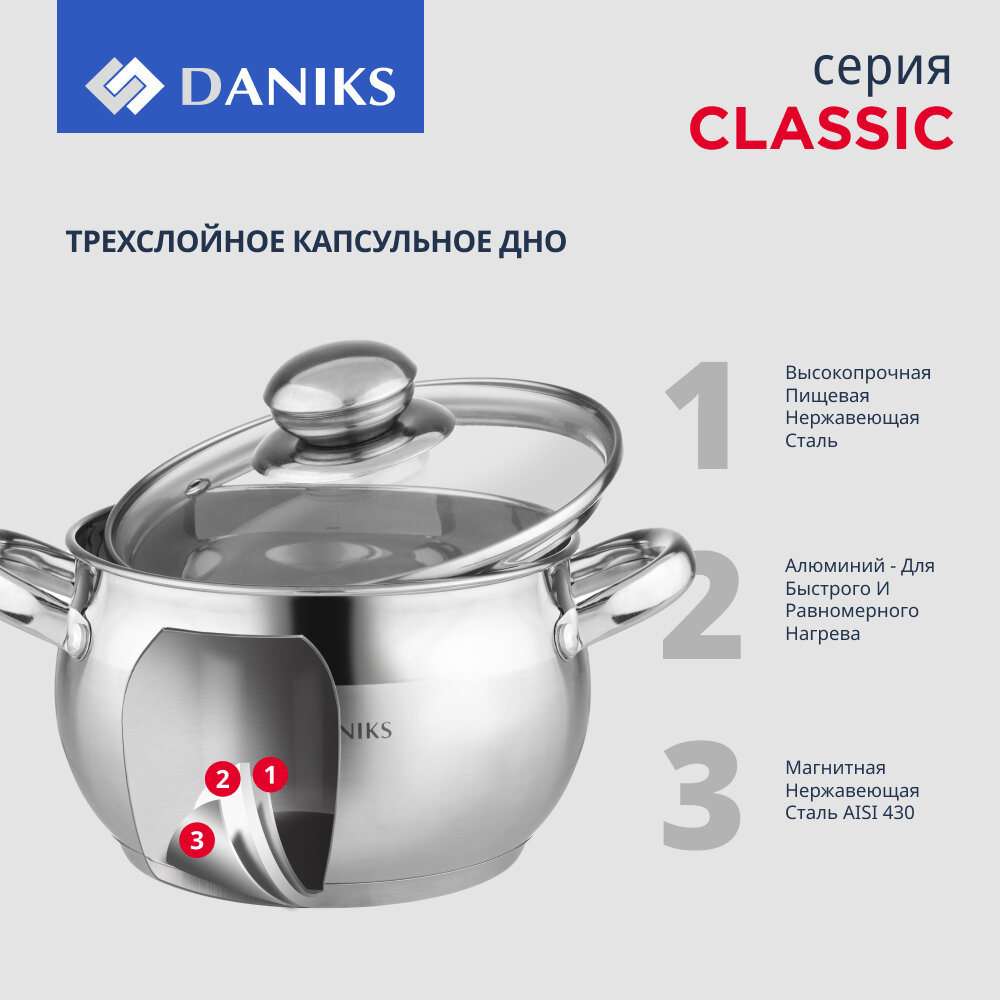 Кастрюля нержавеющая сталь, 6.5 л, с крышкой, крышка стекло, Daniks, Классика, SD-24, индукция