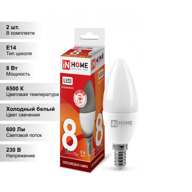 Купить (2 шт.) Светодиодная лампочка IN HOME С37 8Вт 230В 6500К Е14