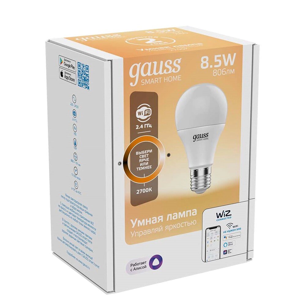 Лампа светодиодная умная 8.5 Вт 800 лм 2700К AC 220-240В E27 А60 (груша) Управление по Wi-Fi, диммируемая Smart Home, GAUSS 1050112 (1 шт.)