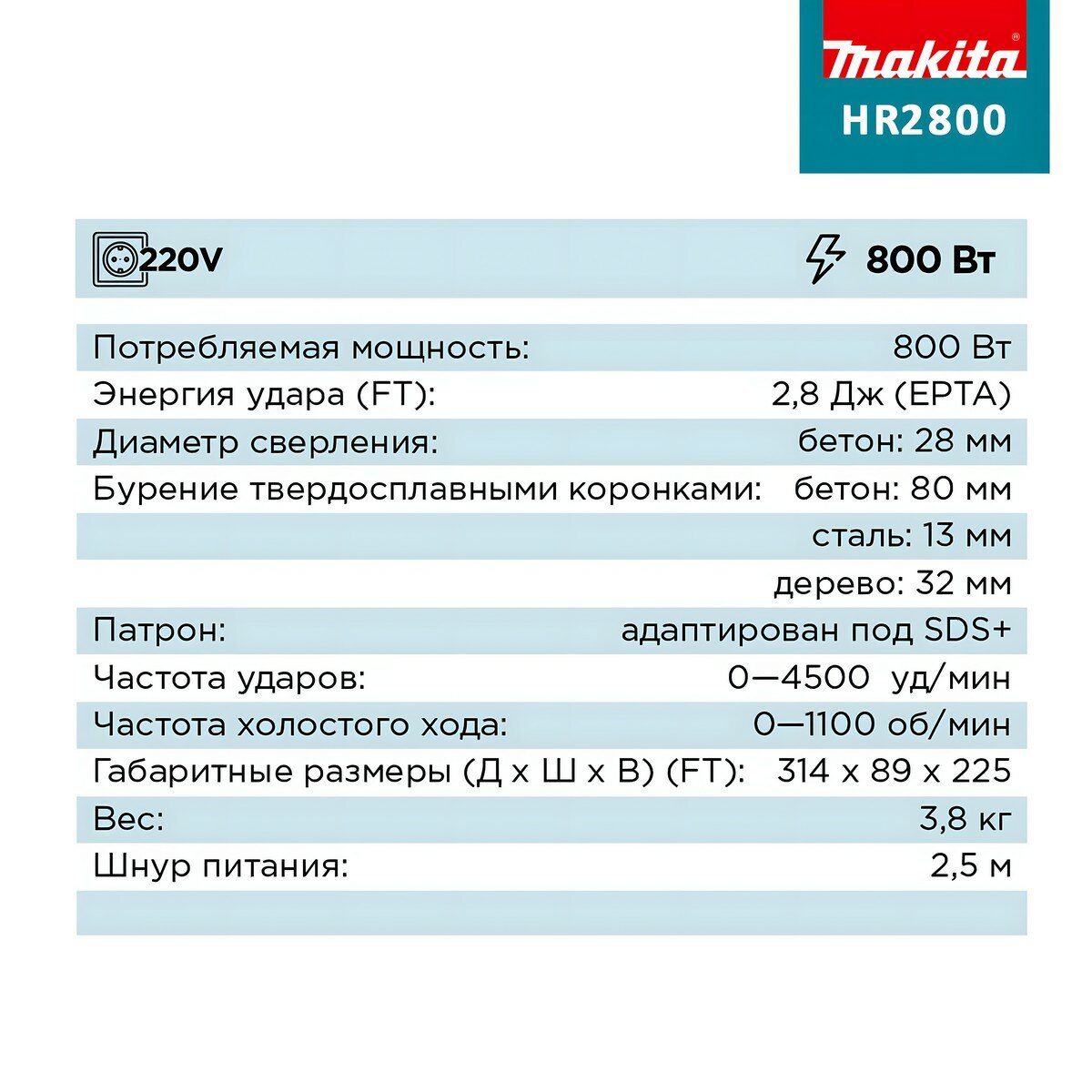 Перфоратор Makita SDS +, 800 Вт, 28 мм, 2.9 Дж, HR2800