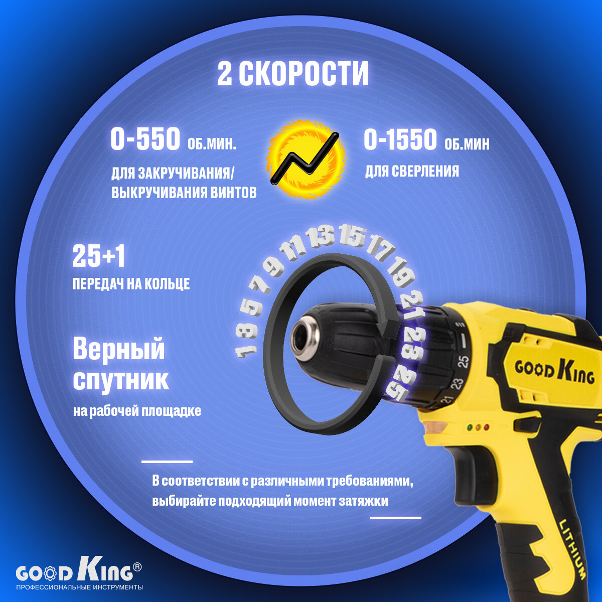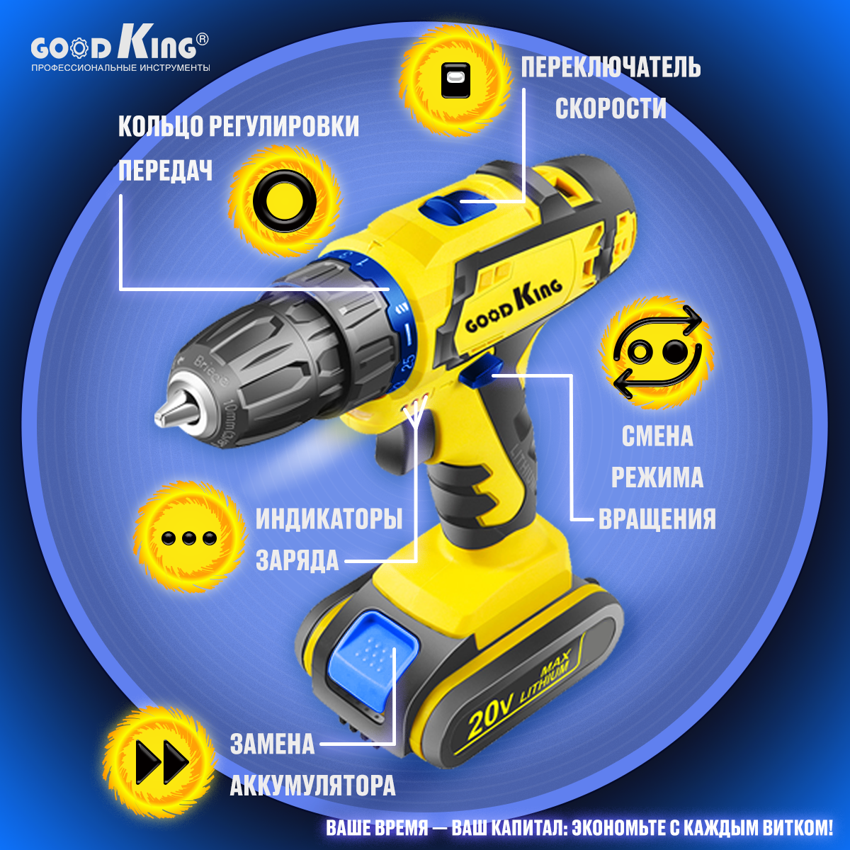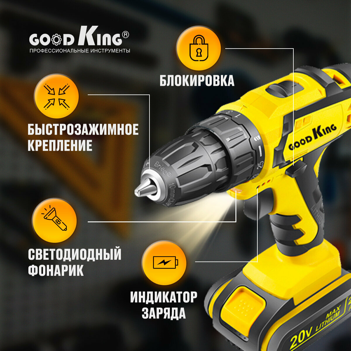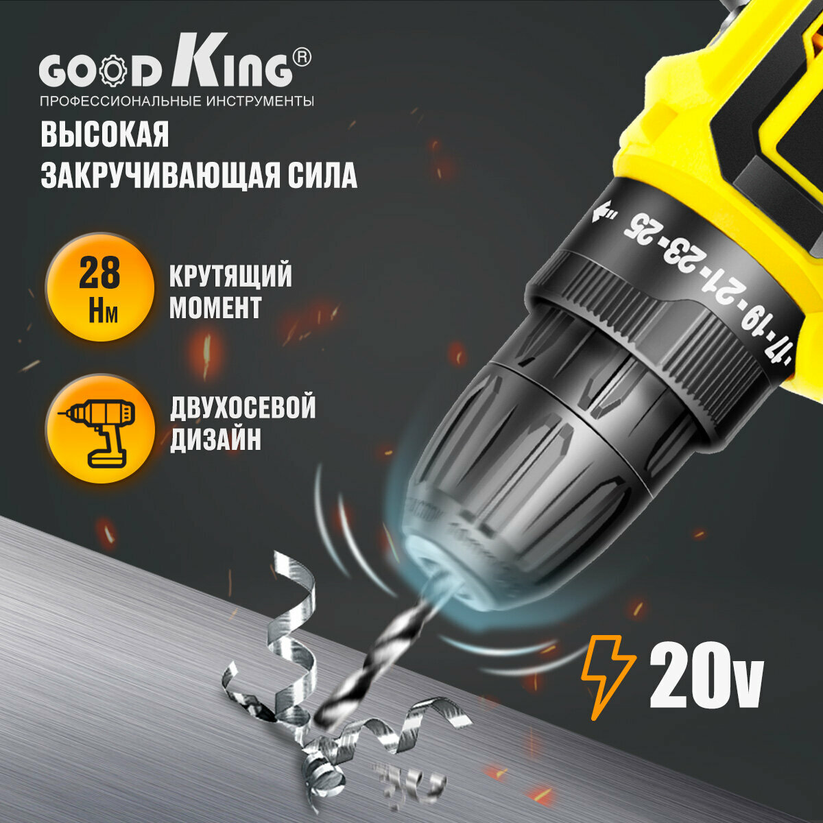 Купить Дрель-шуруповерт, GOODKING KL-102001, сменный аккумулятор, 20В, 28Нм, 1 АКБ, 1.5A*h, аккумуляторная дрель-шуруповерт