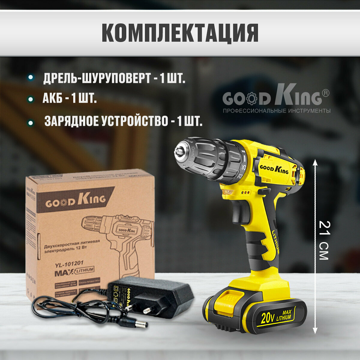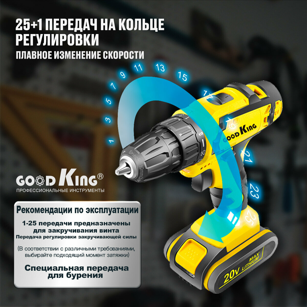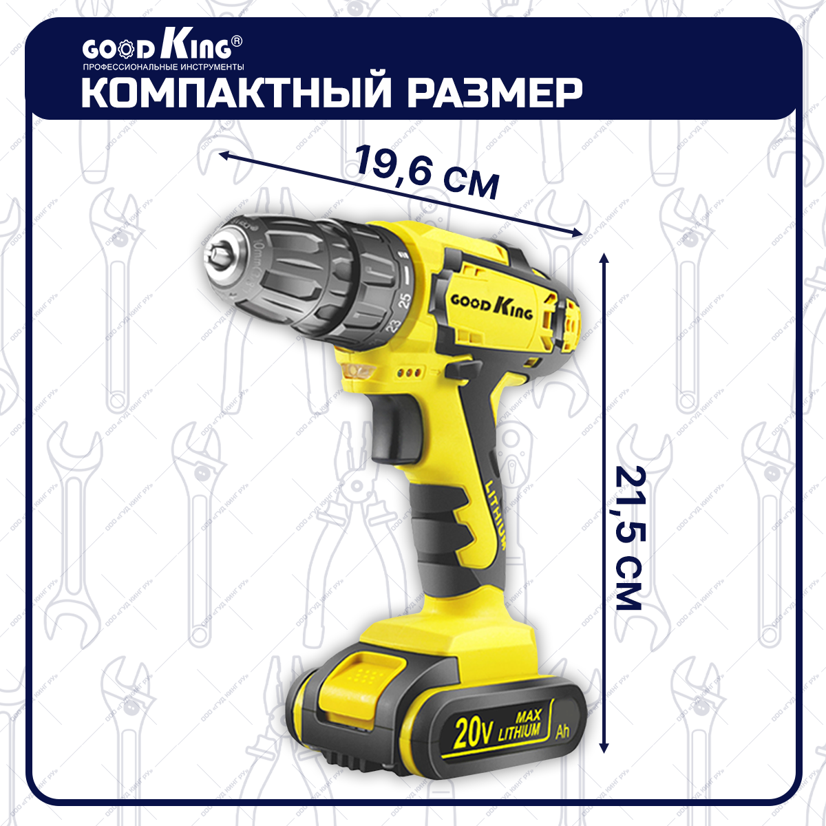 Goodking Аккумуляторная дрель-шуруповёрт KL-102001, 1.5 Ah 20V 28Нм С 1 АКБ