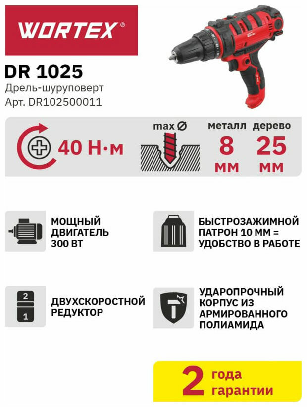 Дрель-шуруповерт WORTEX DR 1025 в кор. (300 Вт, патрон БЗП, 40 Нм, шурупы до 6 мм) (DR102500011)