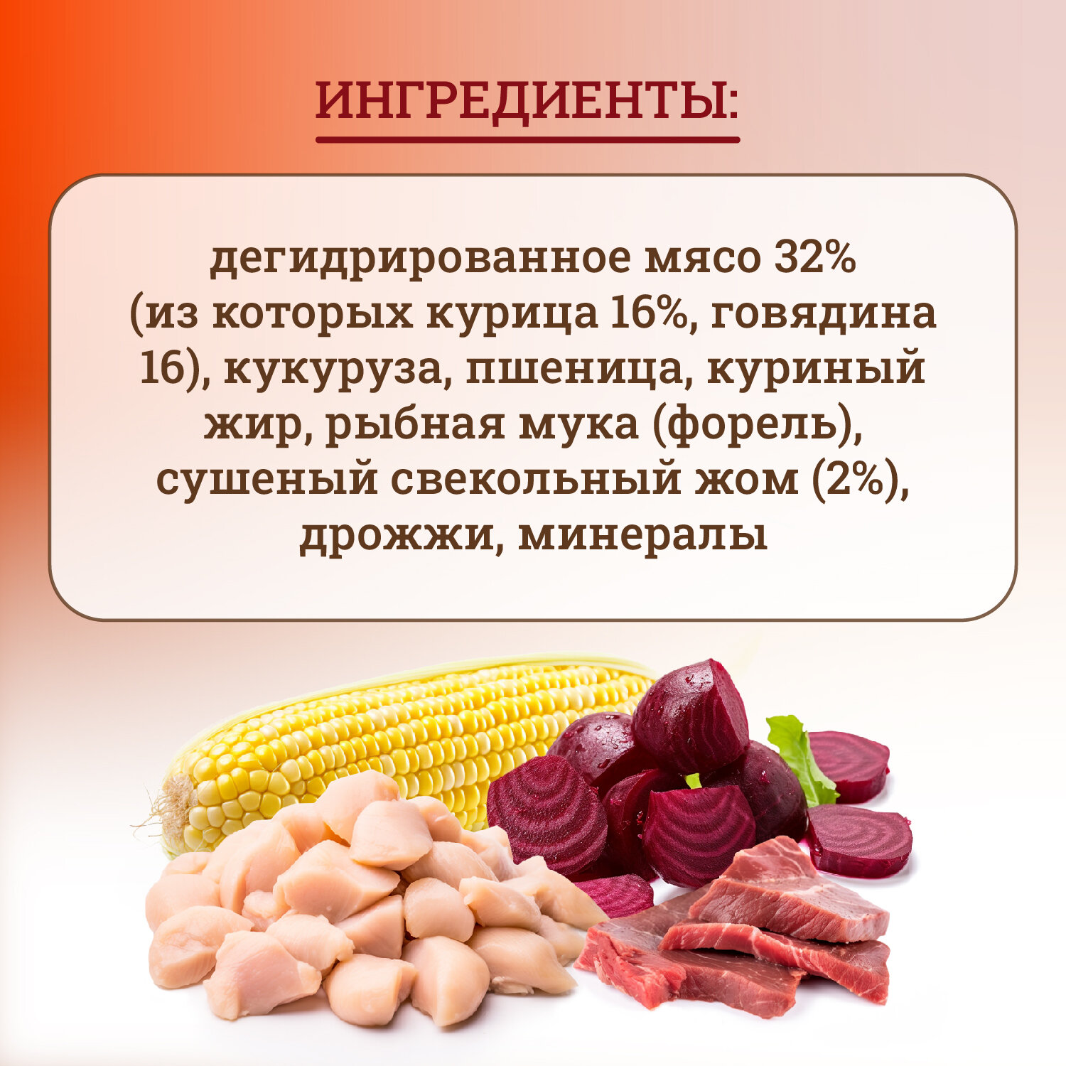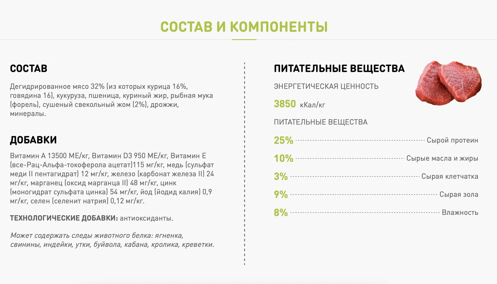 | Состав | регидратированное мясо 63,5% (курица 33%, говядина 27% и 3,5% рыбы), кукуруза, пшеница, куриный жир, рыбная мука, сушеный свекольный жом (2%), дрожжи, минеральные вещества. |