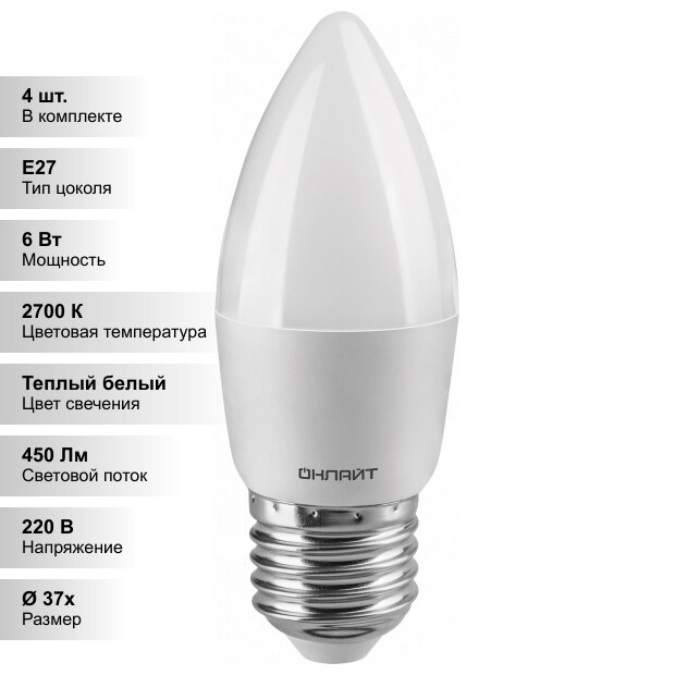Купить (4 шт.) Светодиодная лампочка онлайт C37 6Вт 230В 2700K E27