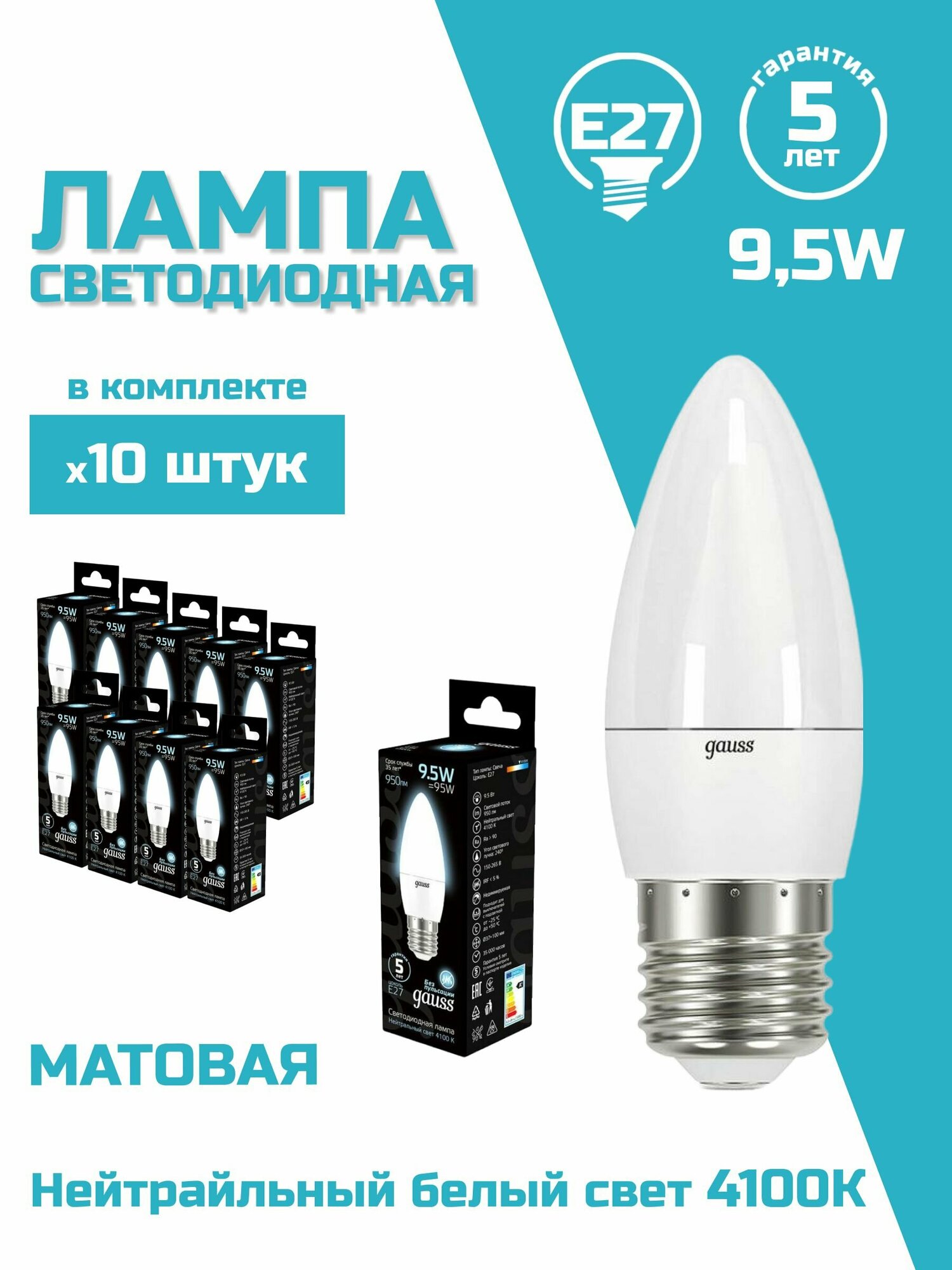 Упаковка светодиодных ламп 10 шт. gauss 103102210, E27, C37, 9.5 Вт, 4100 К