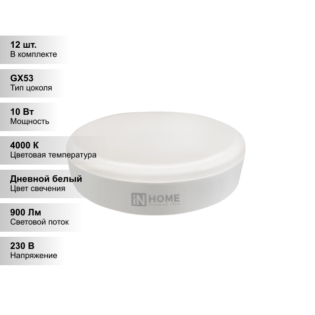 Купить (12 шт.) Светодиодная лампочка IN HOME 10Вт 230В 4000К GX53