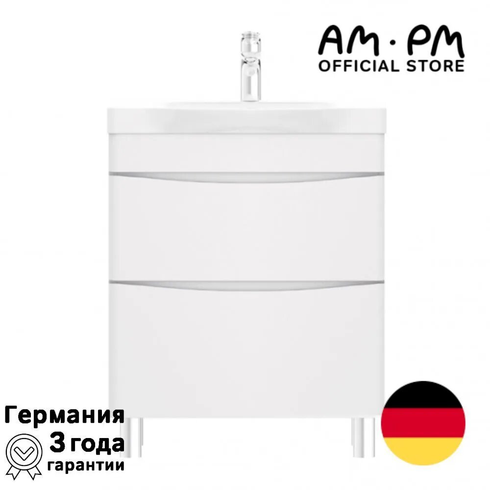 Тумба с раковиной в ванную AM.PM с металлическим донным клапаном, напольная, 80 см, белый глянец, направляющие скрытого монтажа с системой мягкого закрывания soft close, эмалевое покрытие, Германия
