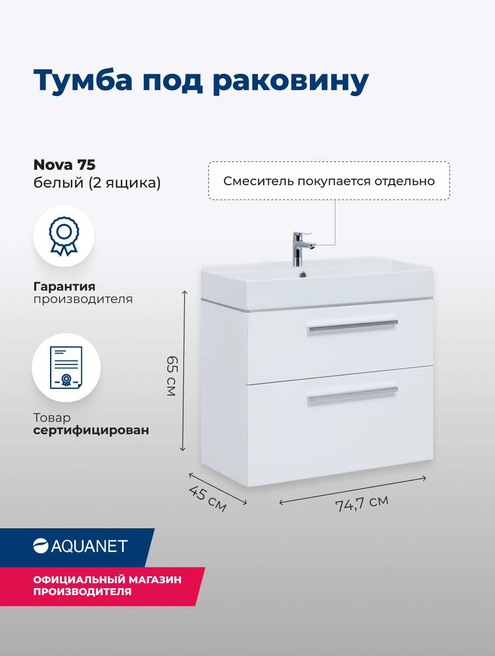 | Дополнительная информация | Тумба Aquanet Nova 75 в стандартной комплектации поставляется без раковины, без ручек и без ножек. Варианты ручек и ножек выбираются дополнительно и приобретаются отдельно. |