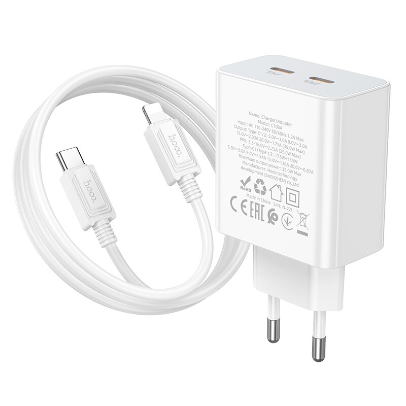 Купить Зарядное устройство HOCO C108A Leader 2*USB-C + Кабель Type-C-Lightning, 35W, белый