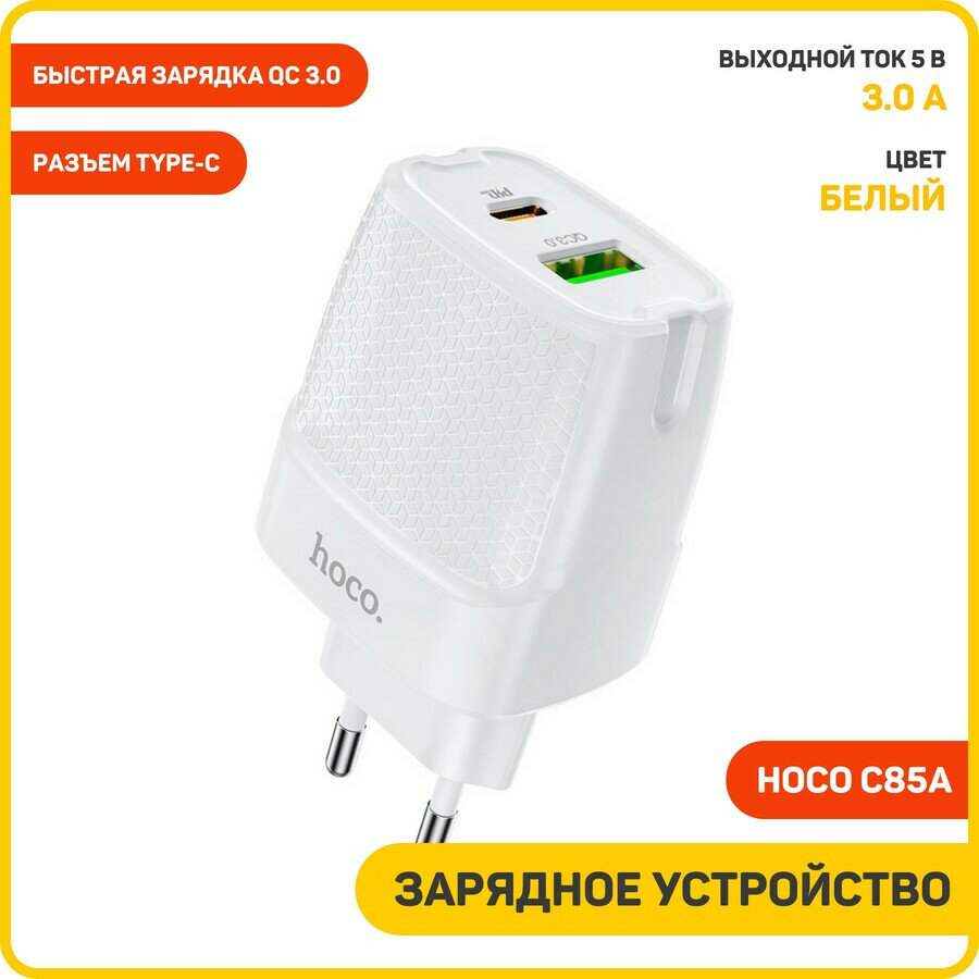 Сетевое зарядное устройство (СЗУ) Hoco C85A QC3.0 (USB+Type-C PD) 3 А, белый