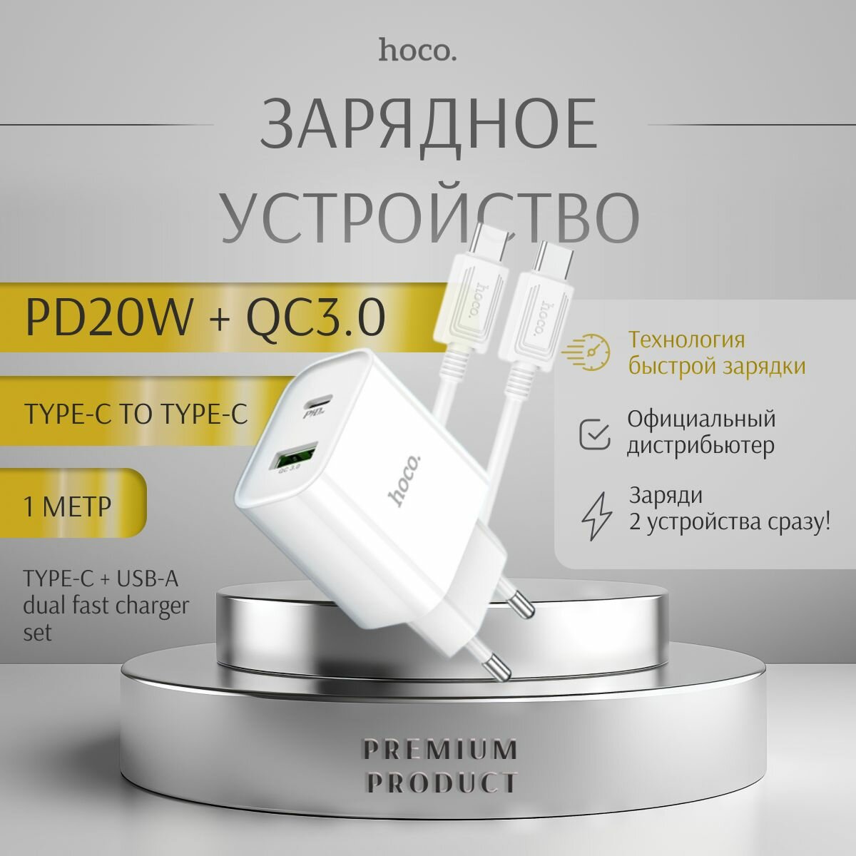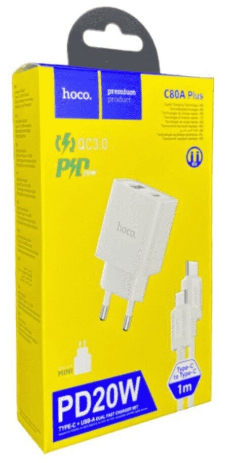 Сетевое зарядное устройство c USB + Type-C HOCO C80A Plus, кабель Type-c + Type-c, QC 3.0, PD 20W, белое