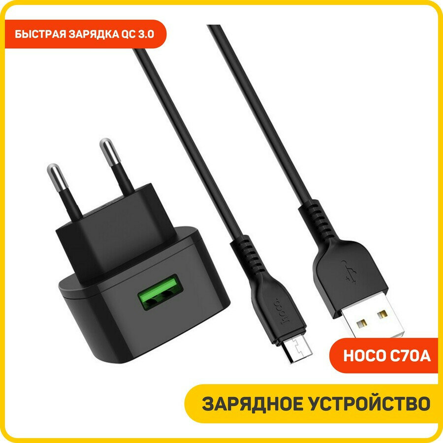 Сетевое зарядное устройство, 1 USB 3.0A (C70A), QC3.0, HOCO, Micro, черный