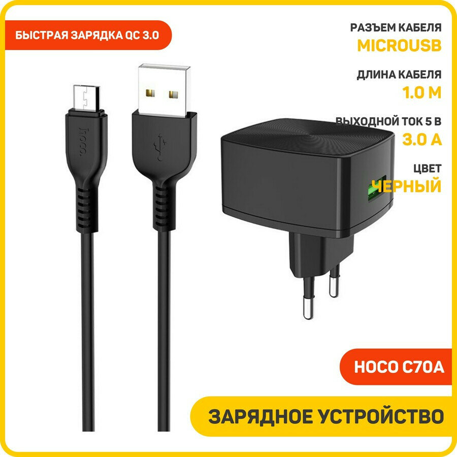 Сетевое зарядное устройство (СЗУ) Hoco C70A QC 3.0 (USB) + кабель MicroUSB, 3 A, черный