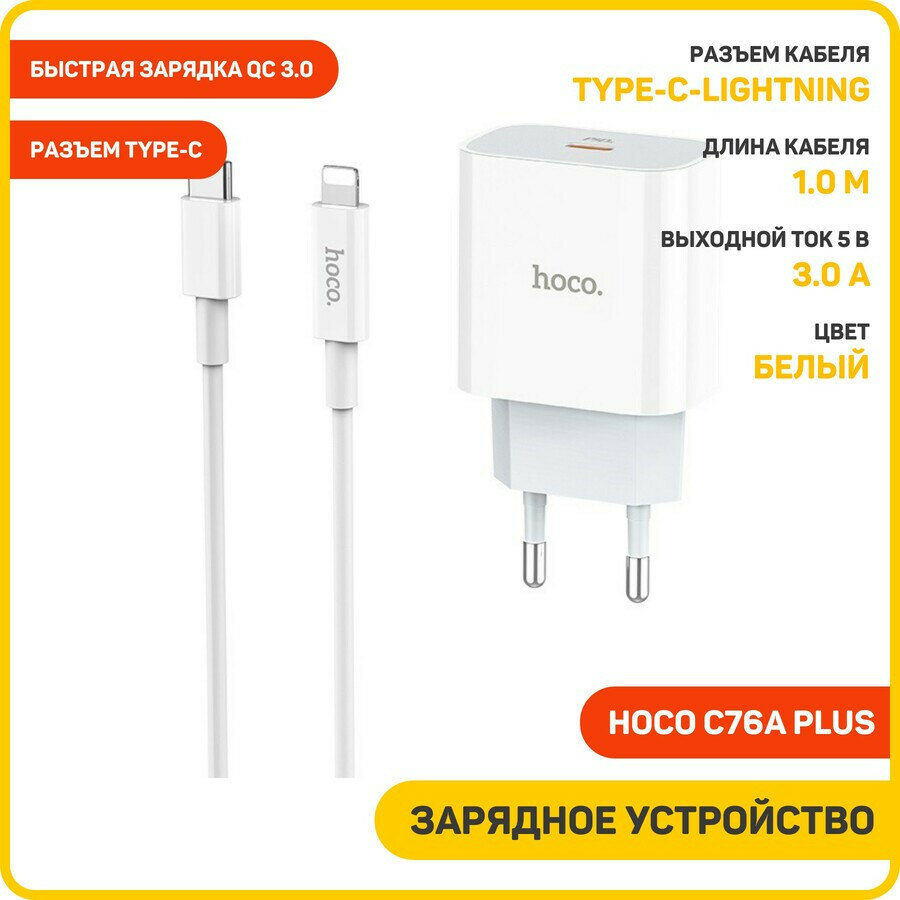 Сетевое зарядное устройство (СЗУ) Hoco C76A Plus (Type-C) + кабель Type-C-Lightning, 3 А, белый