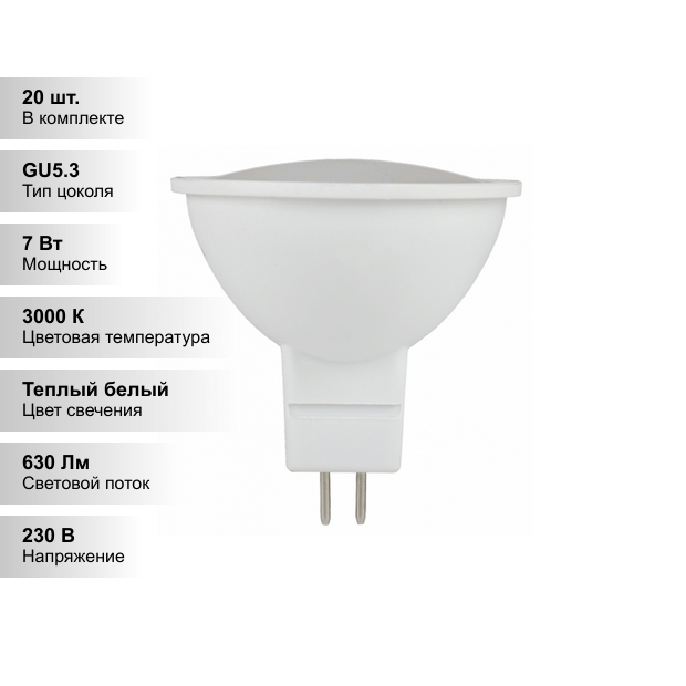 10шт/уп. Лампа LED Спот 7Вт 230B MR16 GU5.3 630Лм 3000К Свет Теплый белый арт. LLE-MR16-7-230-30-GU5 IEK, уп. 10шт