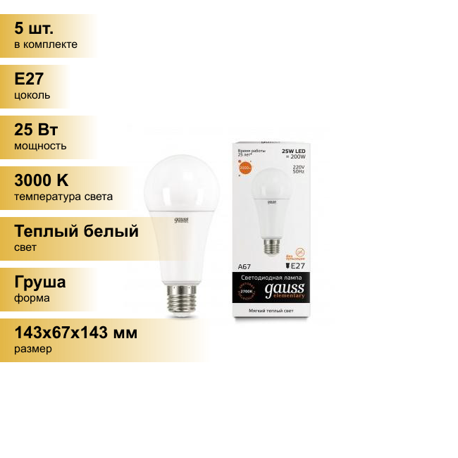 Купить (5 шт.) Светодиодная лампочка Gauss Elementary ЛОН A67 E27 25W(2000lm) 3000K 2K 143x67 матовая, пластик/алюм. 73215 Теплый белый. Цоколь E27