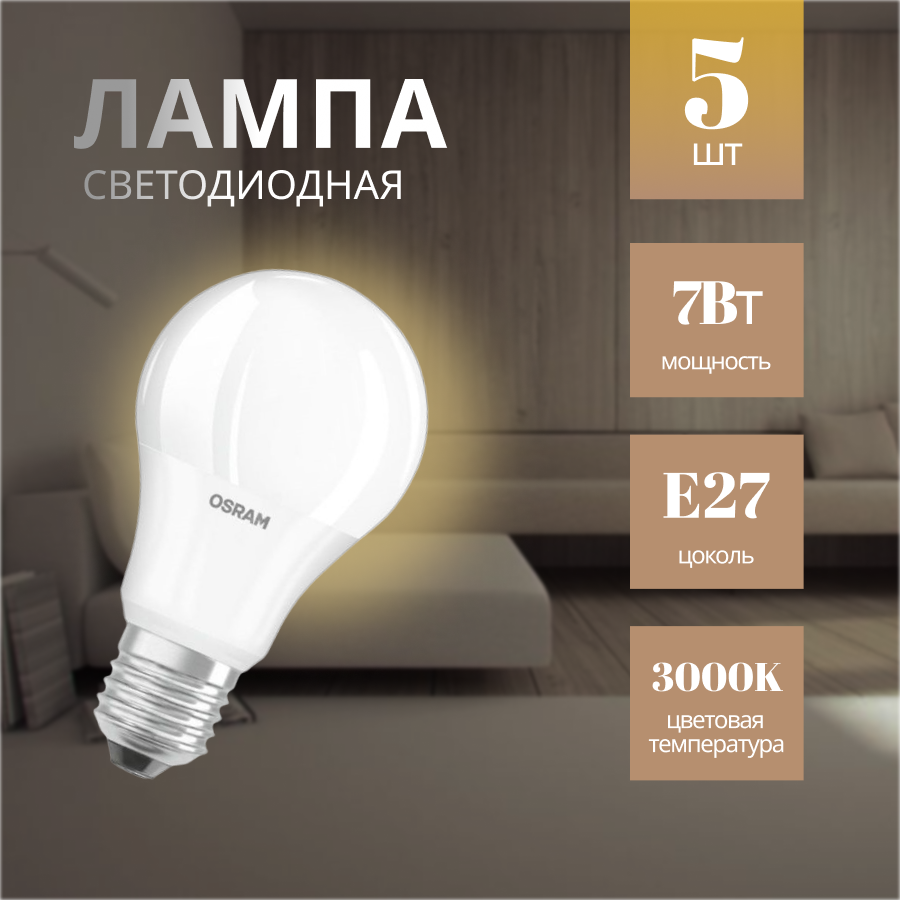 Купить Лампочка светодиодная OSRAM LED Value E27 3000К A60 груша 7Вт 560Лм 4058075577626 (упаковка из 5 шт)