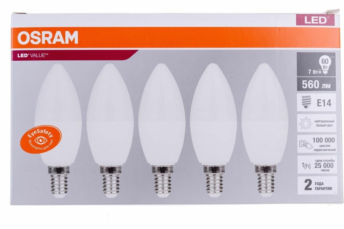 Лампочка светодиодная OSRAM LED Value E27 4000К CL свеча 7Вт 560Лм 4058075578043 (упаковка из 5 шт)