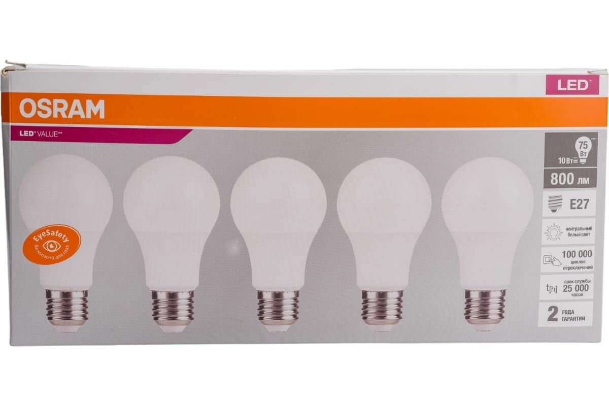 Лампочка светодиодная OSRAM LED Value E27 3000К А60 груша 10Вт 800Лм 4058075577718 (упаковка из 5 шт)