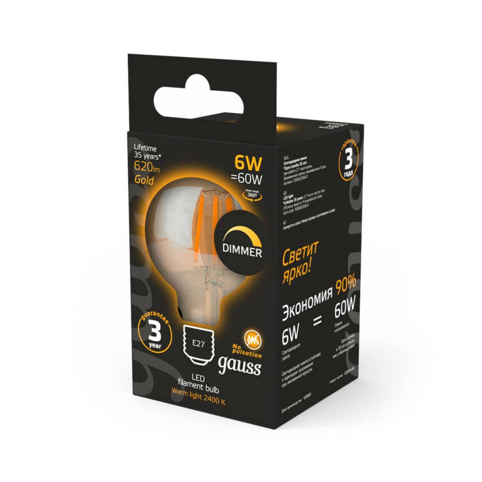 Светодиодная лампа Gauss Filament G95 6W 620lm 2400К Е27 golden диммируемая LED 1/20