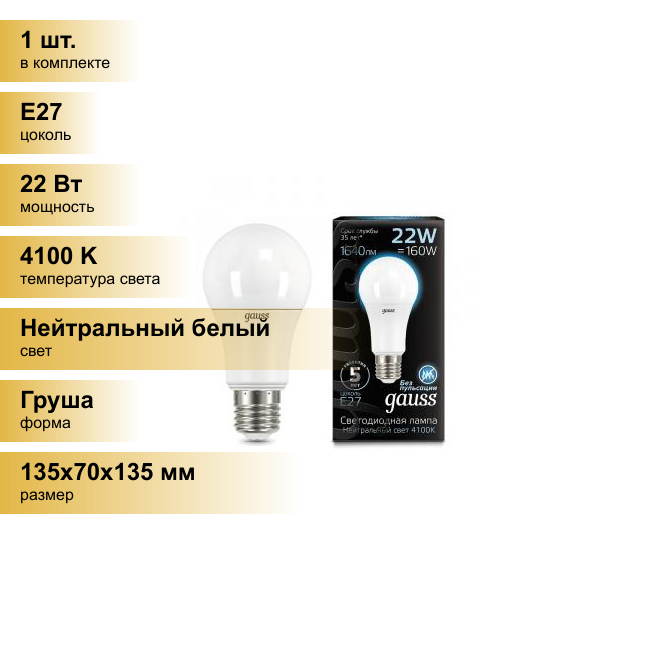 Лампа светодиодная gauss 102502222, E27, A70, 22 Вт, 4100 К