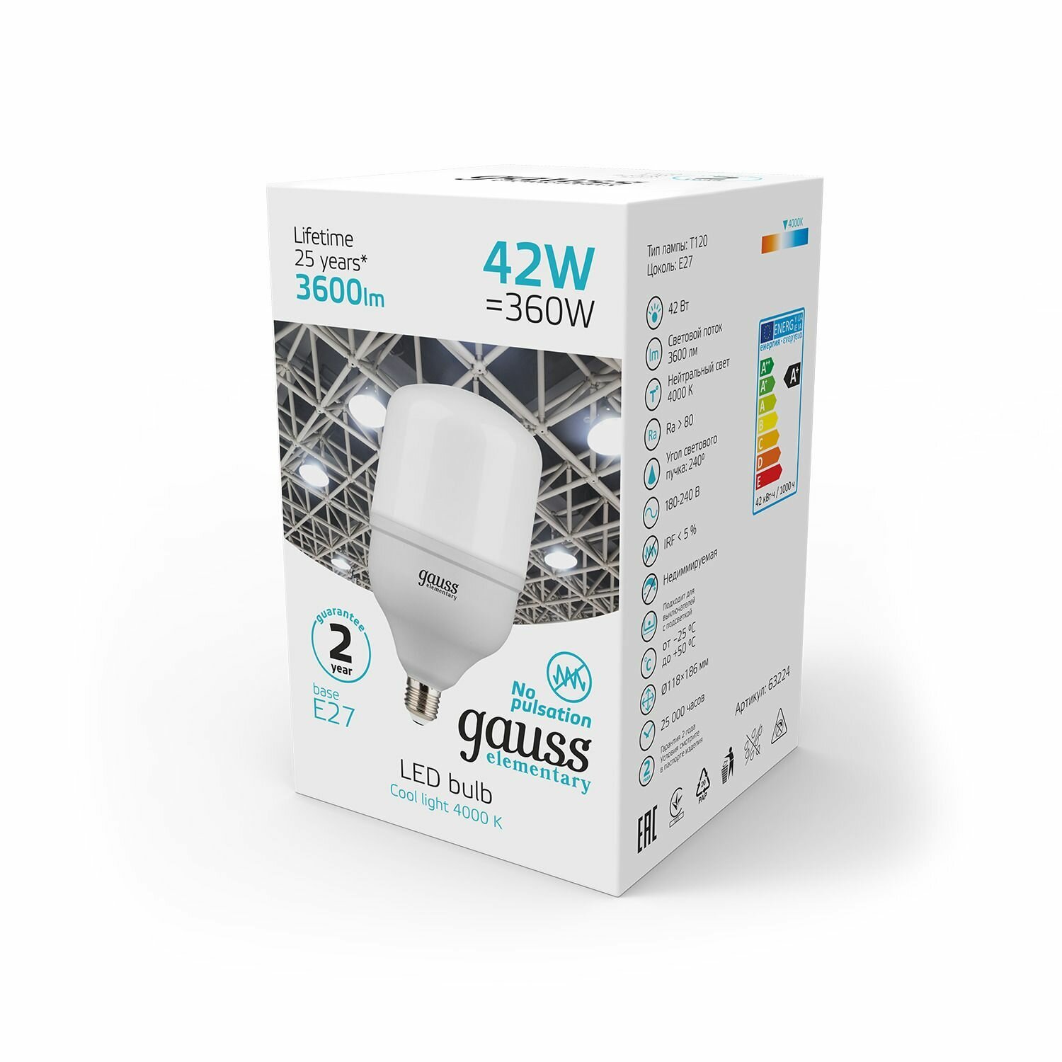 Лампа LED GAUSS Elementary T120 42W/E27/4000K цилиндр 63224